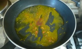 В сковороде разогреть масло, обжарить мелко нарезанный свежий чили, горчицу и куркуму.