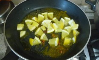Раскрошить сушеный чили и высыпать нарезанный кубиками лимон, приправить щепоткой соли. Жарить, быстро перемешивая, полминуты, снять с огня.