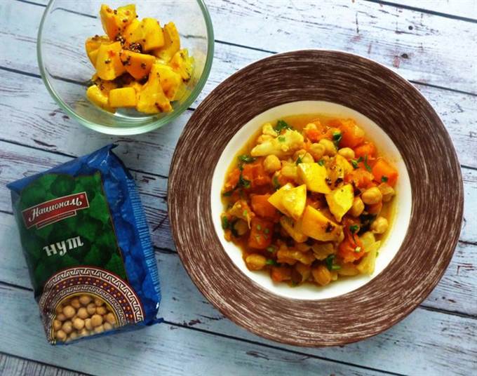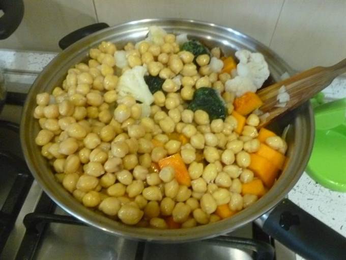 Добавить нут, цветную капусту, шпинат, пасту карри и налить немного кипятка. Готовить под крышкой, время от времени перемешивая, до готовности овощей.