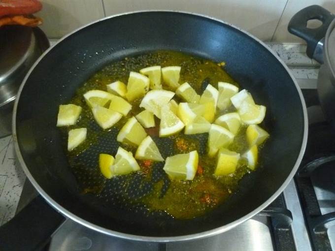 Раскрошить сушеный чили и высыпать нарезанный кубиками лимон, приправить щепоткой соли. Жарить, быстро перемешивая, полминуты, снять с огня.