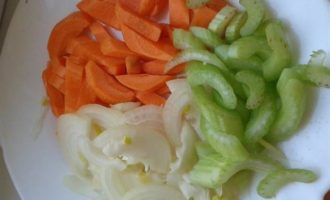 • Лук порезать полукольцами, морковь и сельдерей порезать нашинковать крупно.