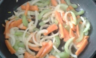 • Сковородку разогреть, добавить растительное масло. Лук, морковь, сельдерей обжарить.