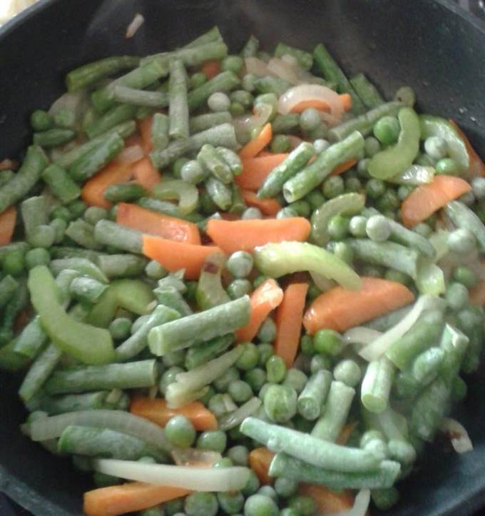 • Добавить мороженную стручковую фасоль, горошек.