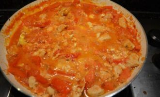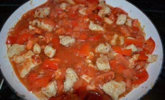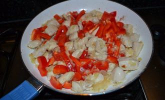 • Перец вымыть, удалить сердцевину и нарезать тонкими полосками. Помидоры опустить с кипяток, вынуть, снять кожицу и мелко порезать. Филе вымыть, обсушить и нарезать небольшими кубиками.