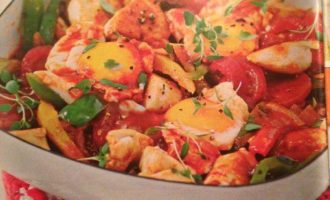 • Затем добавить помидоры, томат-пасту, посыпать солью, чёрным перцем и сушёным тимьяном.