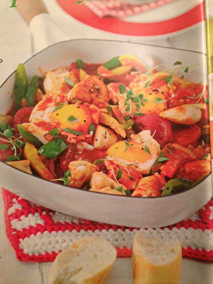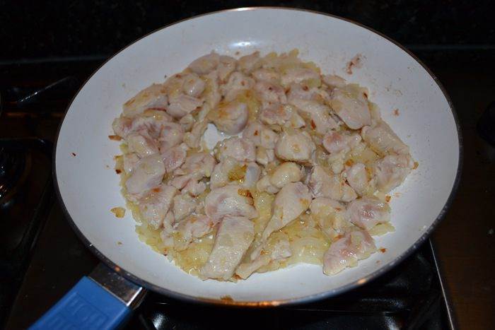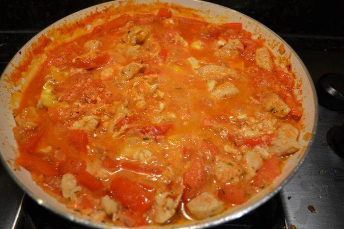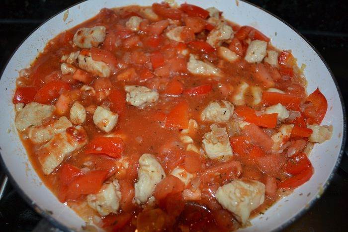 • Перец вымыть, удалить сердцевину и нарезать тонкими полосками. Помидоры опустить с кипяток, вынуть, снять кожицу и мелко порезать. Филе вымыть, обсушить и нарезать небольшими кубиками.