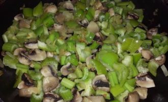 Шляпки шампиньонов моем и крупно режем, добавляем к луку с чесноком. Тушим до испарения жидкости. Затем добавляем нарезанный кубиками болгарский перец и сельдерей, перемешиваем и тушим 3 минуты.