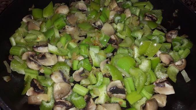 Шляпки шампиньонов моем и крупно режем, добавляем к луку с чесноком. Тушим до испарения жидкости. Затем добавляем нарезанный кубиками болгарский перец и сельдерей, перемешиваем и тушим 3 минуты.