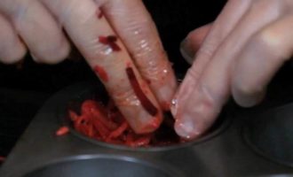 Выложить в формы для кексов в виде чашечек/воронок и убрать в духовку на 20 минут при температуре 205°C.