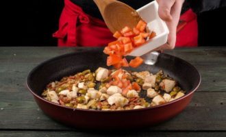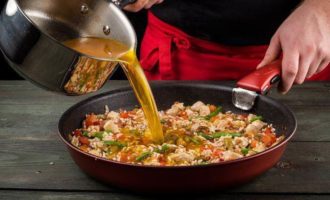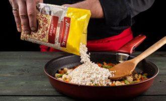 Добавляем перец, фасоль и засыпаем рис Гигант ТМ «Националь».