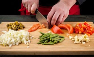 Нарезаем все овощи: перец, помидор, лук, фасоль, чеснок и оливки.