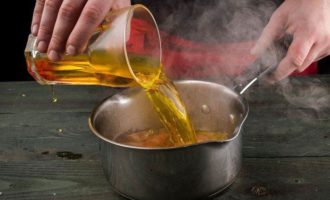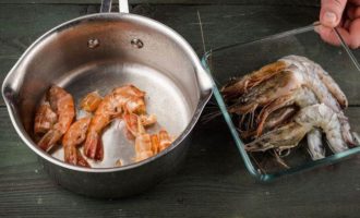 Чистим креветки и обжариваем панцири на оливковом масле.