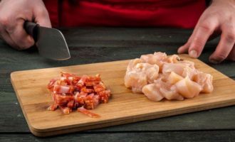 Далее добавляем колбасу и оливки, курицу и помидоры.