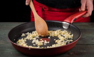 Начинаем делать обжарку. Первым обжариваем лук и чеснок.