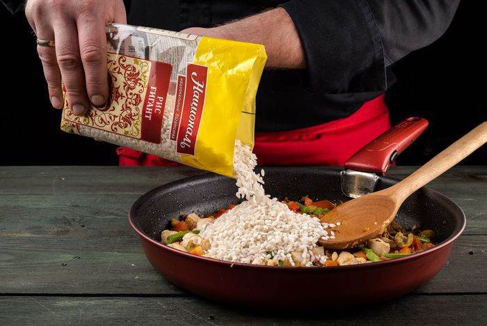 Добавляем перец, фасоль и засыпаем рис Гигант ТМ «Националь».