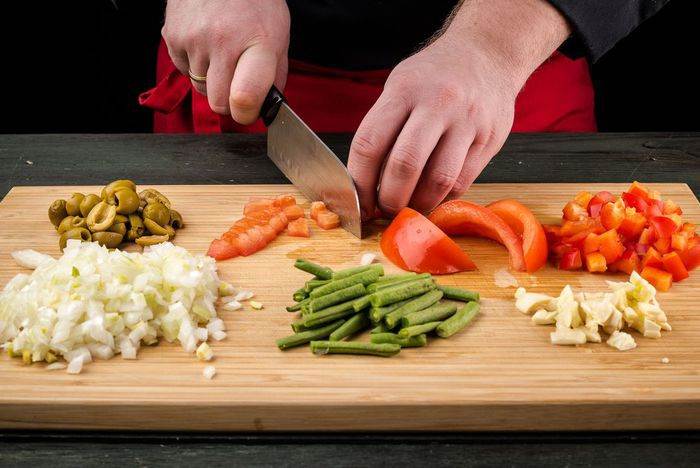 Нарезаем все овощи: перец, помидор, лук, фасоль, чеснок и оливки.