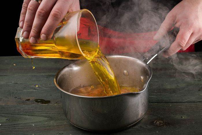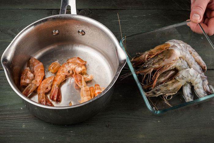 Чистим креветки и обжариваем панцири на оливковом масле.