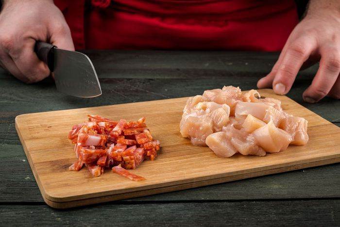 Далее добавляем колбасу и оливки, курицу и помидоры.