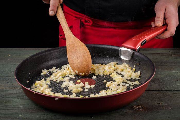 Начинаем делать обжарку. Первым обжариваем лук и чеснок.