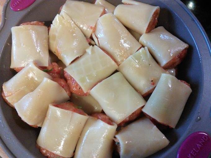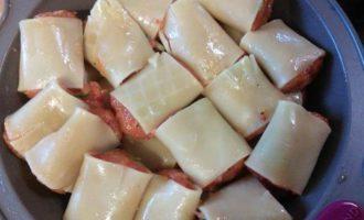 Поставила вариться макароны. Сварить их нужно только на половину, откинуть на дуршлаг. Нафаршировать. Форму сбрызнуть оливковым маслом и уложить пасту в форму. Смазать их поверхности немного маслом, чтобы не высохли.
