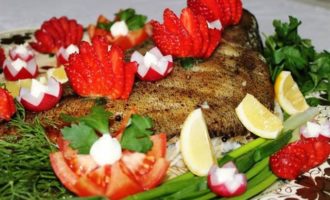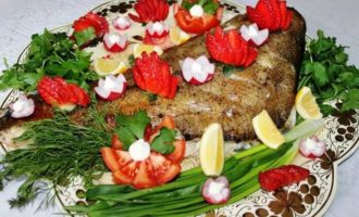 Рыбу переложить (очень аккуратно с помощью двух широких лопаточек) на поднос, украсить зеленью и подать с любыми свежими овощами и лимоном.