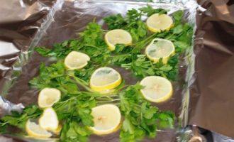 На противень выстелить фольгу в несколько слоев, разложить кружочки лимона и веточки свежей петрушки (по диагонали).