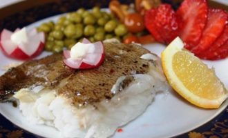 Палтус мне нравится тем, что в нем совершенно нет мелких костей (только хребет с толстыми косточками, который легко удаляется). Поэтому мясо палтуса можно без проблем разложить по порционным тарелкам с помощью сервировочной лопаточки для торта. Украсить овощами, лимоном и клубникой.