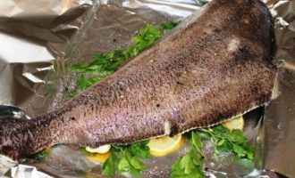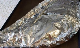 Духовой шкаф нагреть до температуры 230 градусов. Рыбу завернуть в фольгу, плотно закрепить все края и поставить запекаться.
