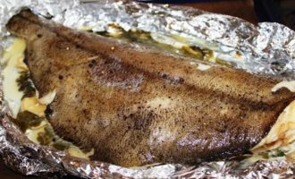 Через минут 30 следует убавить температуру до 200 градусов. Запекать еще минут 15. Затем раскрыть фольгу, завернуть края и поставить палтус запекаться еще на 15 минут, чтобы подрумянился.
