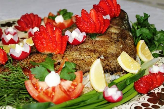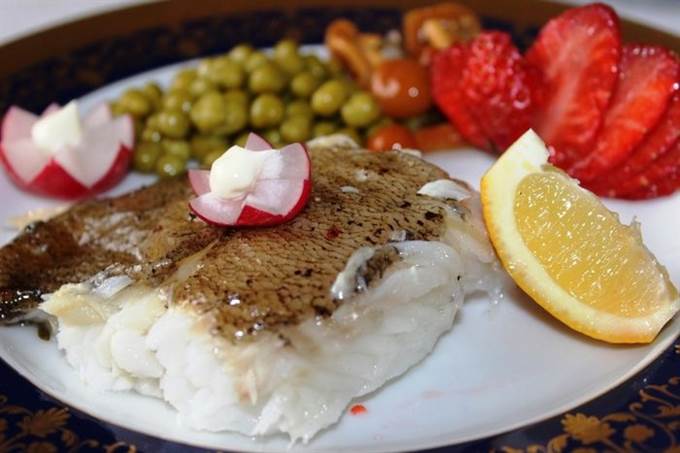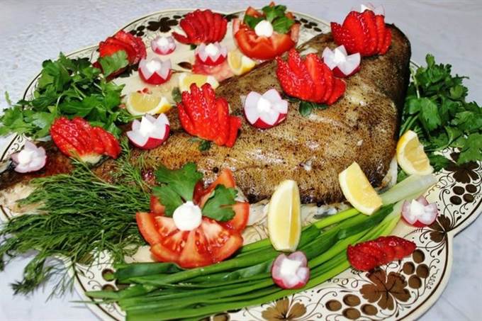 Палтус мне нравится тем, что в нем совершенно нет мелких костей (только хребет с толстыми косточками, который легко удаляется). Поэтому мясо палтуса можно без проблем разложить по порционным тарелкам с помощью сервировочной лопаточки для торта. Украсить овощами, лимоном и клубникой.