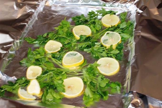 На противень выстелить фольгу в несколько слоев, разложить кружочки лимона и веточки свежей петрушки (по диагонали).