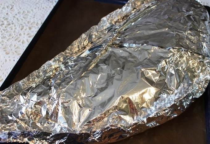 Духовой шкаф нагреть до температуры 230 градусов. Рыбу завернуть в фольгу, плотно закрепить все края и поставить запекаться.