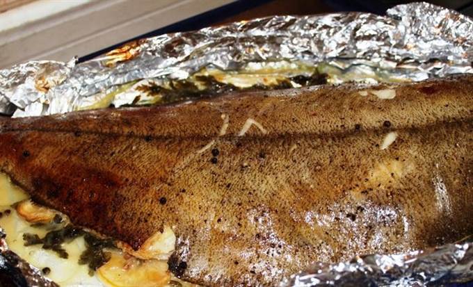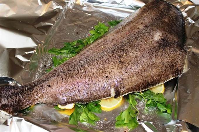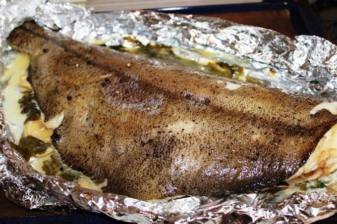 Через минут 30 следует убавить температуру до 200 градусов. Запекать еще минут 15. Затем раскрыть фольгу, завернуть края и поставить палтус запекаться еще на 15 минут, чтобы подрумянился.