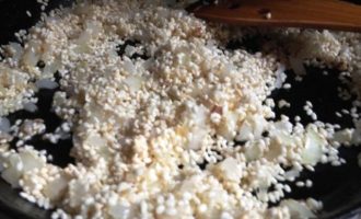 • Добавить в сотейник рис. Продолжать жарить помешивая, пока рис не станет прозрачным. Добавить очищенный и измельчённый чеснок, оба вида паприки, перемешать.