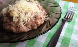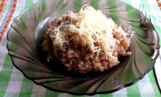 • Сыр натереть на тёрке. Вмешать в ризотто, оставив немного для украшения.