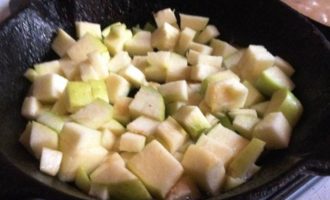 • Яблоко вымыть, обсушить, удалить сердцевину и нарезать кубиками. В другой сковороде разогреть оставшееся масло и обжарить на нём яблоко. Добавить яблоко в ризотто.