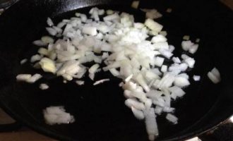 В сотейнике разогреть 2 ст. л. оливкового масла и поджарить лук до прозрачности.