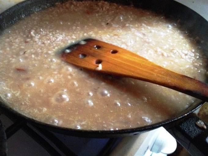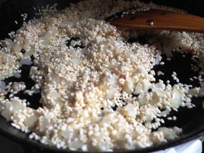 Небольшими порциями вливать бульон и готовить, постоянно помешивая, пока весь бульон не впитается. Посолить. Поперчить по вкусу.