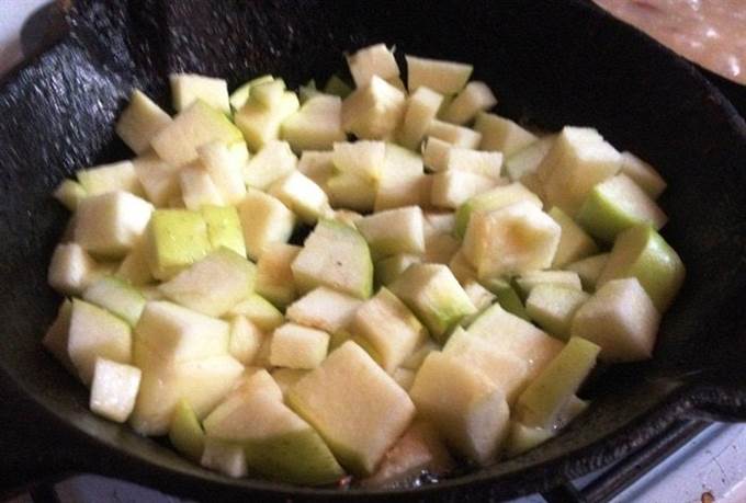 • Яблоко вымыть, обсушить, удалить сердцевину и нарезать кубиками. В другой сковороде разогреть оставшееся масло и обжарить на нём яблоко. Добавить яблоко в ризотто.