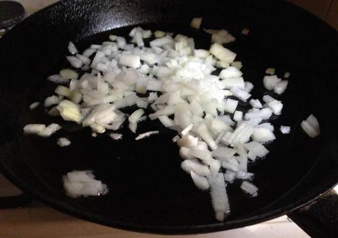 В сотейнике разогреть 2 ст. л. оливкового масла и поджарить лук до прозрачности.
