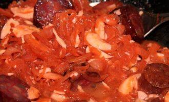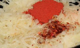 Лук нарезаем полукольцами и отправляем пассероваться туда, где до этого были колбаски. Готовим до того момента как лук «обмякнет». Добавляем паприку и красный острый перец, перемешиваем, добавляем немного воды и протушиваем пару минут.