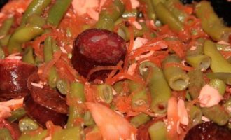 Отварную фасоль отбрасываем на дуршлаг, обдаем холодной водой, даем стечь и отправляем к колбаскам. Добавляем водички и тушим 10 минут, помешивая периодически.
