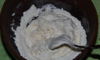 Затем к муке порциями подмешиваем сметану так, чтобы не образовывались комочки. Если сметана сильно густая можно добавлять водичку.