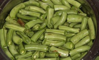 Фасоль моем, чистим и нарезаем на кусочки 3-4 сантиметра. Отвариваем до полуготовности минут 15-20.