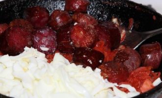 Возвращаем колбаски и добавляем рубленный белок яичный.