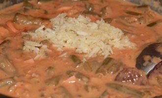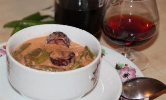 Выливаем наш соус в посуду с паприкашем, перемешиваем, добавляем еще воды и тушим на маленьком огне все вместе до загустения.