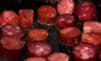 Здесь такой момент: если вас не пугает жирность блюда, обжаривайте их на растительном масле. Я обжаривала без масла, у меня образовалось достаточно жира для последующей пассеровки лука. Так что тут каждый принимает решение сам. После обжарки колбаски выкладываем в отдельную емкость.