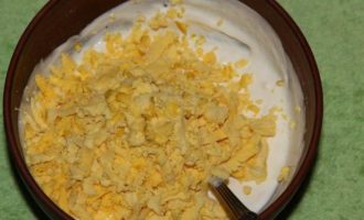 Затем на терке натираем желток и добавляем к сметанно-мучной смеси
