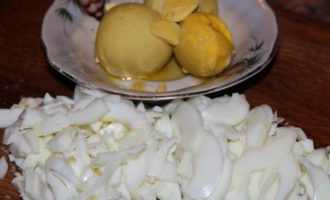 Отвариваем вкрутую яйца. Разделяем на белок и желток. Белок рубим ножом.