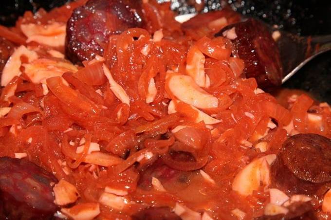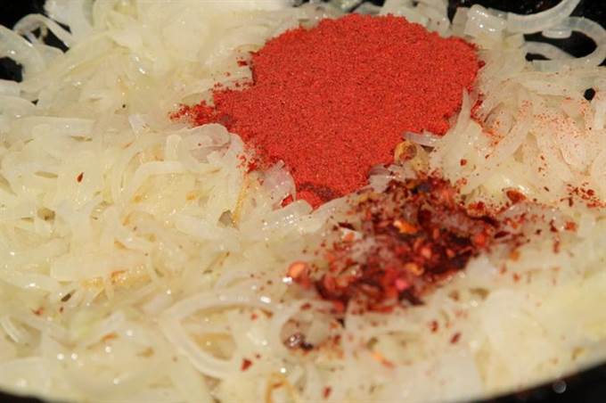 Лук нарезаем полукольцами и отправляем пассероваться туда, где до этого были колбаски. Готовим до того момента как лук «обмякнет». Добавляем паприку и красный острый перец, перемешиваем, добавляем немного воды и протушиваем пару минут.